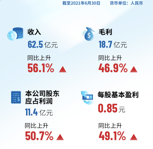 2021年上半年,集团业绩实现高质量发展。公告显示,集团上半年营业额为人民币62.47亿元,较去年同期增长56.1%;毛利18.73亿元,同比增加46.9%,毛利率为30.0%;股东应占利润为11.42亿元,同比增加50.7%。每股基本盈利为0.85元。