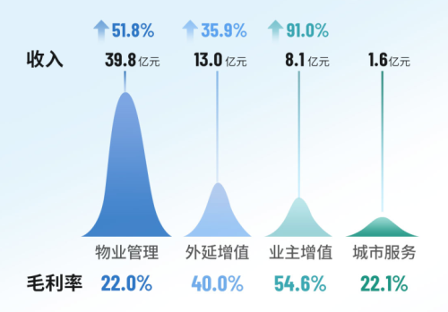 通过精细化运营及科技赋能,雅生活集团运营效益稳步提升,收入结构进一步优化,核心业务占比提升至近八成,核心业务毛利占比超七成。其中,物业管理服务收入同比增长51.8%至39.77亿,外延增值服务收入同比增长35.9%至13.03亿元,业主增值服务收入同比增长90.9%至8.07亿元,城市服务收入达1.59亿元。