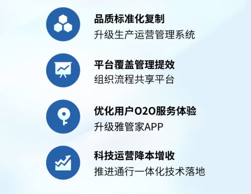 在科技赋能方面,雅生活集团将以服务业务发展为核心,以提升企业经营管理效能为目标,在数据端、管理端进一步提升信息化分析、运营能力,融合技术与服务,实现科技应用效能最大化;同时,依托住宅、非住宅领域管理经验和在管项目规模优势,携手领先的云技术及智能科技合作伙伴,在业务端培育及输出智能服务标杆产品,实现管理模式及服务体验的全面升级。